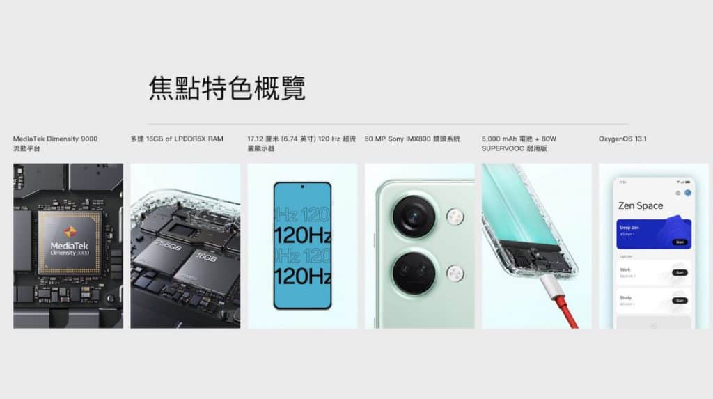 據 OnePlus 官方網頁公佈數據,OnePlus Nord3 配備 MediaTek 天璣 9000 晶片組,LPDDR5X RAM 及 UFS 3.1 儲存組合,畫面方面採 93.5% 屏佔比 6.74 吋 2,772 x 1,240 像素 120Hz 更新率 AMOLED 中置開孔屏,攝影部份由 IMX890 感光元件 5,000 萬像 OIS 主鏡、800 萬像 112° 廣角跟 200 萬像 4cm 微距組成三攝像模組,內置等效 5,000mAh 雙電芯電池,並對應 80W SuperVOOC 閃充。