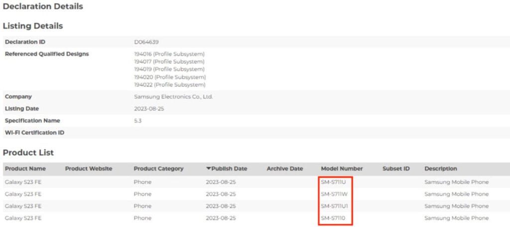 網頁顯示 6 款裝置均對應藍牙 5.3 制式,其中 SM-S711B/DS 的產品描述頁更列明該裝置產品將名為 Galaxy S23 FE。