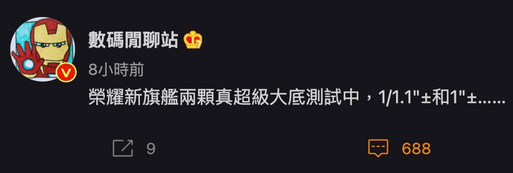 據國內爆料達人「數碼閒聊站」在其微博帳號發言,指 Honor 正在進行旗艦手機攝影功能測試,樣本機分別搭載了現時業界頂級的 1 吋感光元件、跟受光面積稍低的 1/1.1 吋感光元件兩組樣本。
