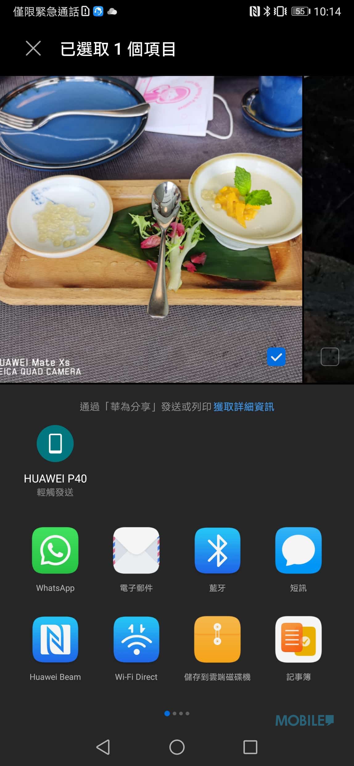▲如果想將文件及照片傳到第二部 HUAWEI 手機內,用戶只需直接選擇 “華為分享“後,介面內就會出現其他開啟”華為分享“ HUAWEI 手機,只要按對方的手機就可以直接將資料傳送。