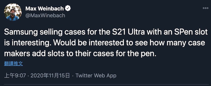 至於 S Pen 支援方面,據稱 S21 Ultra 的螢幕將可使用 S Pen,但就不會隨機附設,需用家另外購買。有趣的是,Max Weinbach 提到三星將發售一款附設 S Pen 筆插的保護套(估計將同時能為 S Pen 作無線充電),以便用家另外購買及使用。
