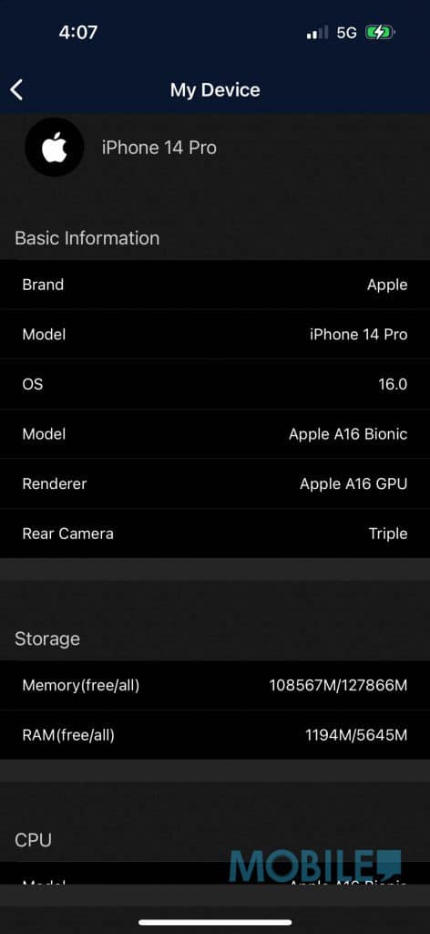 試用 128GB 版本 iPhone 14 Pro,預載 iOS 再配合 A16 仿生晶片效能出眾,從《Antutu》內 My Device 一欄得知裝置具 6GB RAM,而在各效能測試表現上,手機在《GeekBench》CPU 測試多核部份獲高達 5,327 分數表現超群;另外 iPhone 14 Pro 的圖像表現亦相當不錯,《3DMark》與《GFXBench》的 High Tier 測試均達頂級水平。