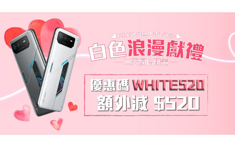 白色情人節將至,為答謝大家一直支持,ASUS Mobile HK 藉著節日送禮!由明天起至 3 月 16 日於 ASUS Store 進行三天網店限定優惠,選購指定 ROG Phone 6 / 6D ,再輸入優惠碼「WHITE520」 即可享額外 $520 折扣,低至 $6,278 入手旗艦電競手機;另外全線手機配件均有 8 折優惠!