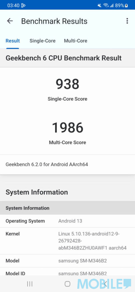 硬件表現方面,Galaxy M34 5G 採用自家 Exynos 1280 晶片組,港版 6+128 儲存在 《Antutu》V10 版獲 46.8 萬分成績,《GFXBench》各項 Normal Tier 畫質遊戲測試幀率表現穩定,在入門 5G 手機中效能及遊戲體驗算是不錯。