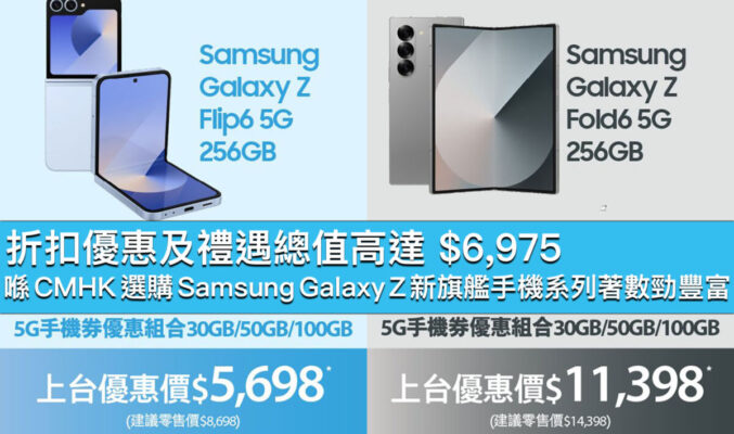 隨著 Samsung 全新旗艦摺屏手機 Galaxy Z 系列強勢登場,CMHK 準備了一系列出機折扣優惠,以及豐厚禮遇回饋客戶,折扣優惠及禮遇總值高達 $6,975,讓客戶盡享 CMHK 及 Samsung 極致 5G 組合帶來的智能生活體驗。