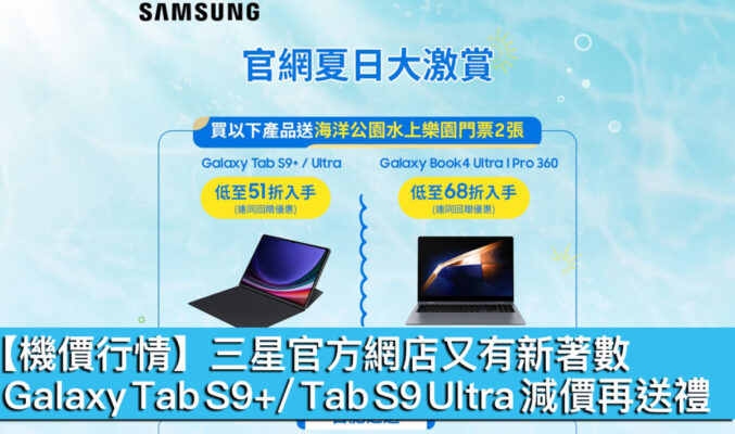 今日(8 月 24 日)本港 IT 業界購物著數,焦點多半集中在《香港電腦節2024》;不過稍早前三星香港官方網店,又悄悄更新「官網夏日大激賞」優惠內容,加入了 8G2 旗艦平板 Galaxy Tab S9+ 跟 Galaxy Tab S9 Ultra 等平板跟筆電購物優惠。