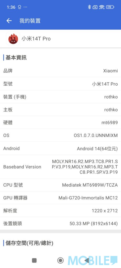 ▲Xiaomi 14T Pro 預載 Android 14 跟 HyperOS介面,啟動後扣除儲存相片、約佔用 27.1GB 左右空間。