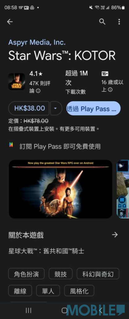 本文刊登時,《STAR WARS:KOTOR》跟《STAR WARS:KOTOR II》兩款手遊,於 Android 平台分別提供優惠,港區 Google Play Store 能以半價下載。