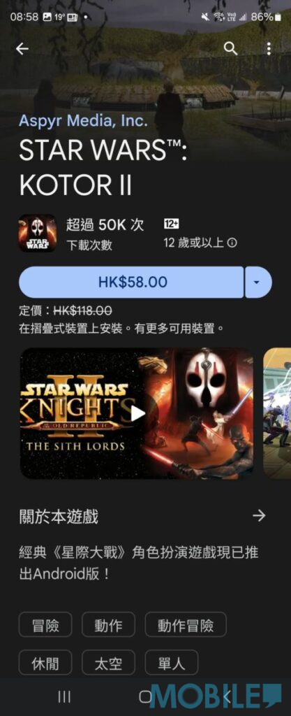 同時間港區 App Store 《STAR WARS:KOTOR》及《STAR WARS:KOTOR II》iOS 版,亦以同樣價格($38/$58)提供下載。