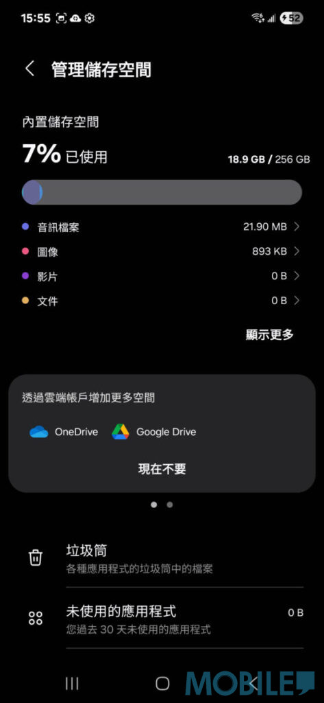 ▲ 預設撥出 4GB 容量至 RAM Plus,256GB 機型啟動後裝置約佔用 18.9GB 空間
