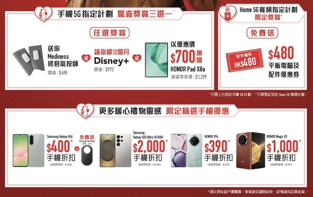 對於需要經常外出工作的爸爸,SmarTone推出超值流動5G計劃。由即日起,新上台或續約客戶選用月費$239或以上的5G服務,即可從三款精選禮品中任選其一:價值$498的Mediness修身氣按師,幫助紓緩日常肌肉疲勞;總值$972的12個月Disney+標準計劃,讓全家享受影視娛樂;或以優惠價$700換購原價$1,299的HONOR Pad X8a平板電腦,提升工作效率與娛樂體驗。