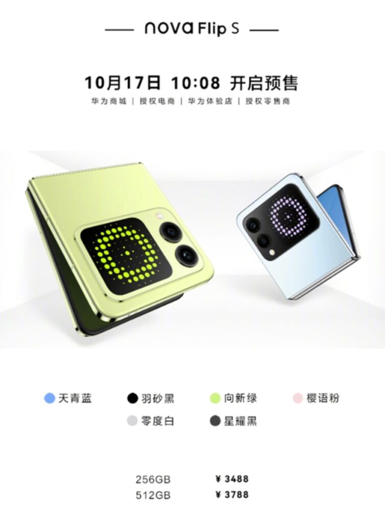 價格方面,HUAWEI nova Flip S 設有兩種儲存版本:256GB 型號定價 $3,488,512GB 版本則為 $3,788。提供櫻語粉、零度白、天青藍、星耀黑、羽砂黑、向新綠六款時尚配色。