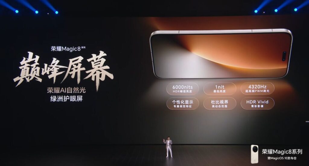 Magic8 採用 6.58 吋 1.5K OLED 直屏,支援 120Hz LTPO 自適應刷新率與 4320Hz 高頻 PWM 調光,HDR 模式下峰值亮度可達 6000nits,全局峰值亮度為1800nits,在顯示效果與護眼之間取得完美平衡。而 Magic8 Pro 則將屏幕尺寸提升至 6.71 吋 (1256 x 2808),同樣支援 120Hz LTPO 技術。