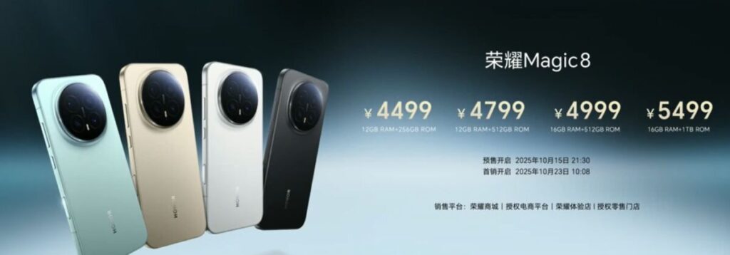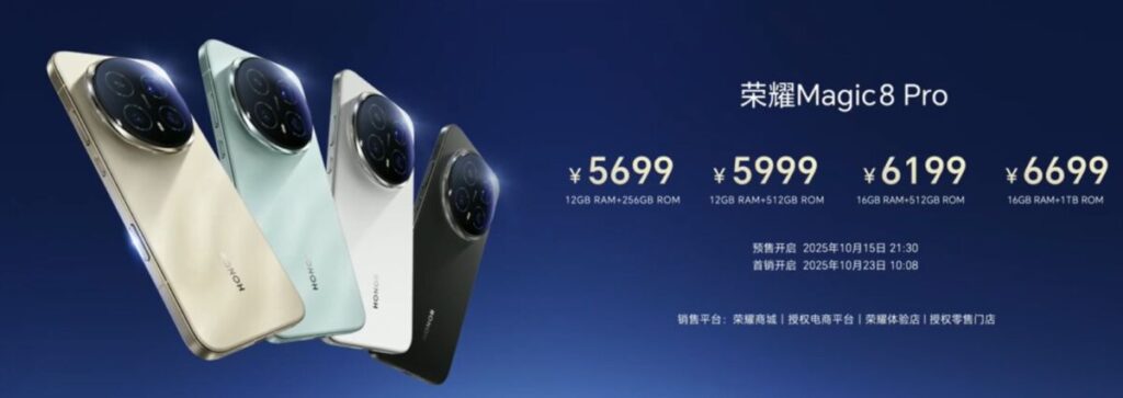 Magic8 系列現已在國內開放預訂,10 月 23 日正式開售。Magic8 提供四種配置選擇,分別是 12GB + 256GB 版售價 4499 人民幣、12GB + 512GB 版 4799 人民幣、16GB + 512GB 版 4999 人民幣、16GB + 1TB 版 5499 人民幣。Magic8 Pro 同樣提供四種配置,分別為 12GB + 256GB 版 5699 人民幣、12GB + 512GB 版5999 人民幣、16GB + 512GB 版 6199 人民幣、16GB + 1TB 版 6699 人民幣。兩款機型均提供晨曦金、天青色與黑色三種配色選擇。