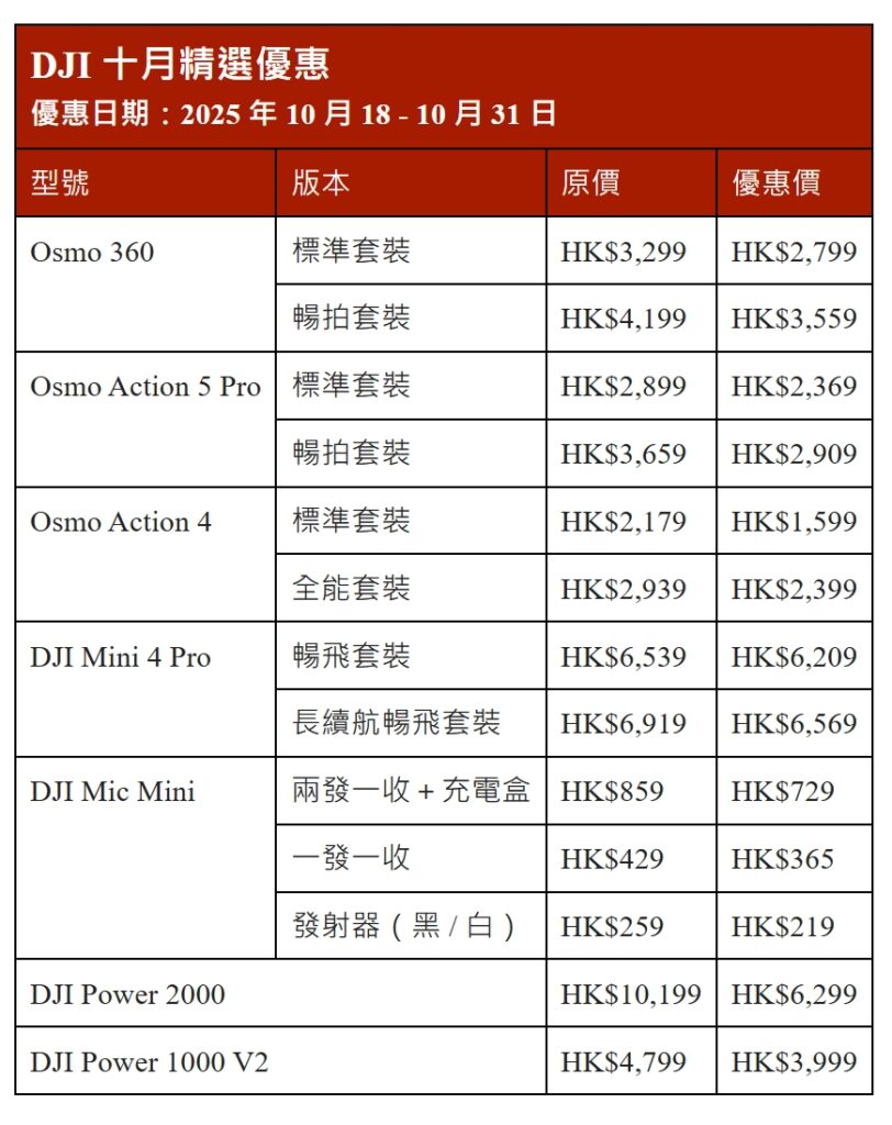 - DJI 十月優惠浪潮來襲!Osmo 360、Action 5 Pro 首降,Mini 4 Pro 與 Mic Mini 抵上加抵!