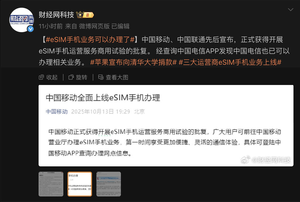 日前國內三大網絡運營商中國移動、中國聯通及中國電信,先後宣佈正式開通 eSIM 業務,標誌無實體 SIM 時代正式開始;同日 Apple CEO 庫克亦發表文章,確認 iPhone Air 國行版將開放預售,售價 7,999 人民幣(約港幣 $8,750)起。