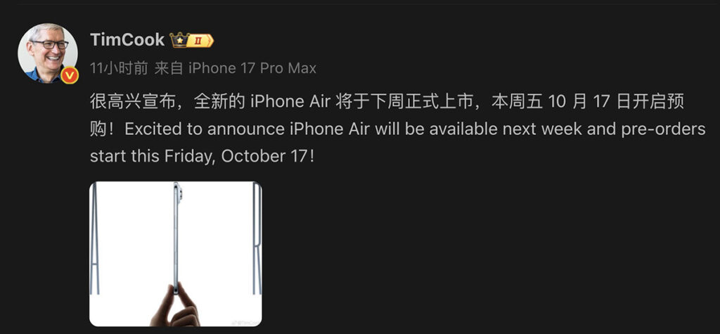 同時間 Apple CEO 庫克在國內 Apple 官方直播間親身「帶貨」,其後宣佈 iPhone Air 國行版將在 10 月 17 日(週五)預售、22 日(下週五)上市。