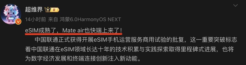 而除了 iPhone Air 外,下一款配備 eSIM 裝置,或有機會為 HUAWEI 同走輕薄路線的 Mate Air 智能手機。