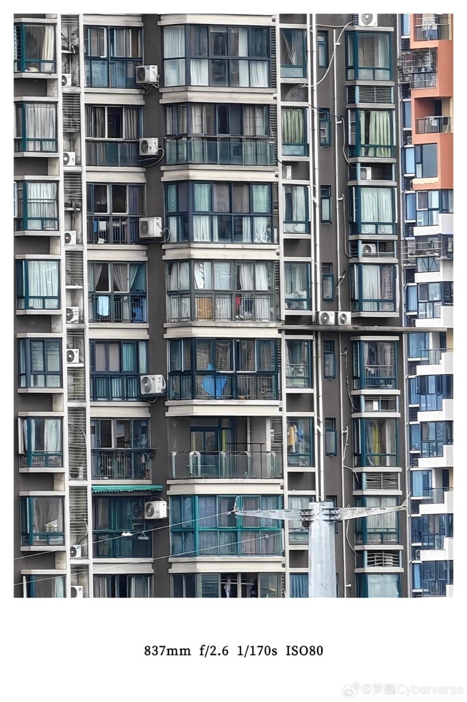 其中一組 837mm 焦距 F2.6 1/170s ISO 80 的建築物長焦相片,原比例顯示可看到單位玻璃幕牆細節,出眾影像穩定以及訊噪抑制表現。
