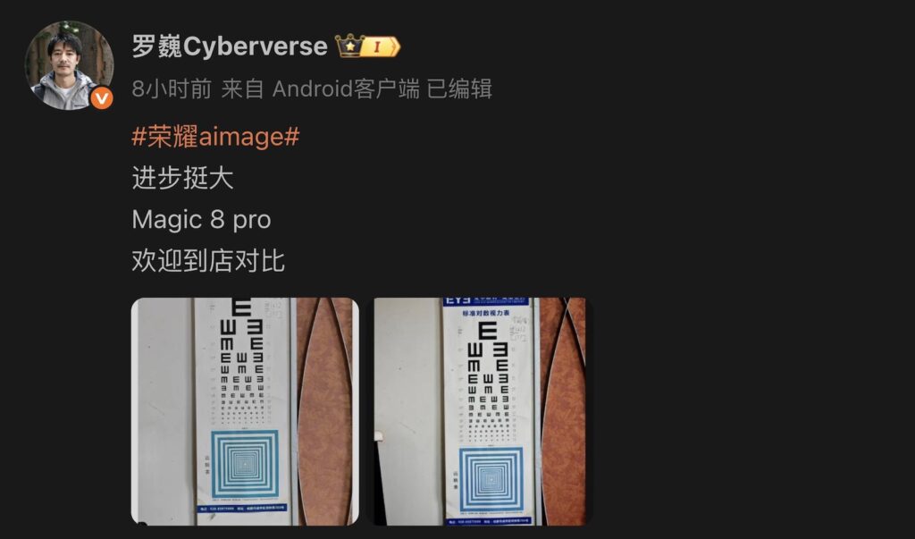 除展示裝置攝力,羅氏亦在文中提到「歡迎對店對比」,信心十足。HONOR Magic8 系列預計本月發佈,將具 S8 Elite Gen 5 晶片、跟自進化 AI 原生應用等功能。