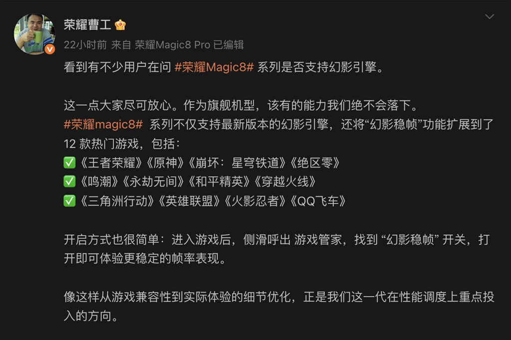HONOR Magic 系列手機系統工程師透過「榮耀曹工」帳號,確認國行 Magic8 系列將支援「幻影引擎」新版本,能作執行遊戲時喚出「遊戲管家」使用。