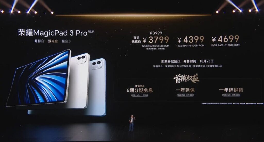 Honor MagicPad 3 Pro 在國內市場的官方定價由人民幣 3,999 人民幣起,對應 12GB + 256GB 版本。首發期間於 JD.com 及 HONOR 官方商城可享優惠價 3,799人民幣。至於 12GB + 512GB 及 16GB + 512GB 版本則分別定價為 4,399 人民幣及 4,699 人民幣。顏色提供浮光流金、月影白及星空灰三種選擇。