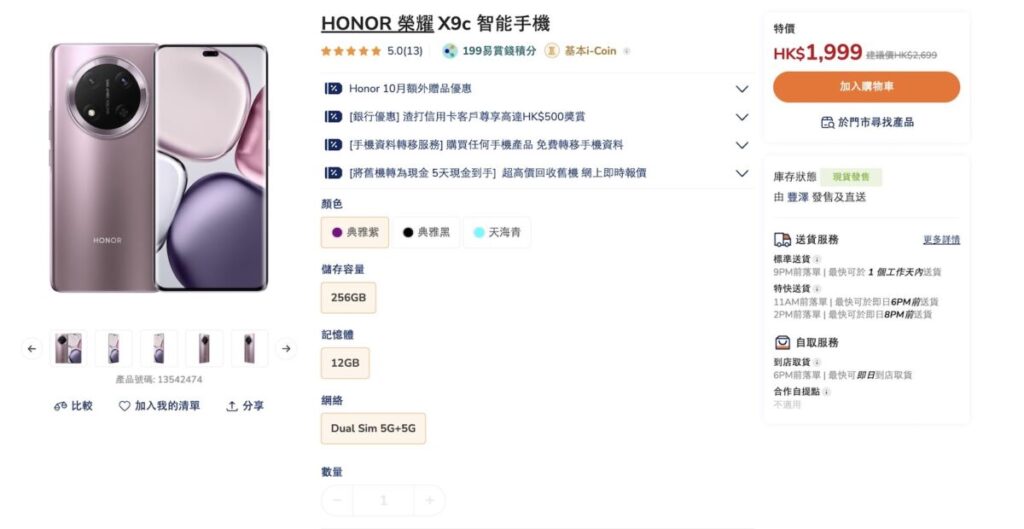 HONOR X9c 5G 優惠價 $1,999(原價 $2,699)由豐澤香港官方網店提供,受惠機型包括港版 12+256 儲存典雅紫、典雅黑及天海青色款,需以易賞錢帳號入手。