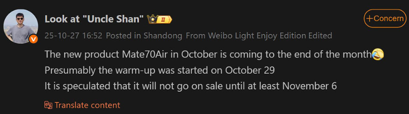 據知名科技爆料人 UncleKanshan 最新透露,華為已確定將於本月底正式發表全新產品 Mate 70 Air,具體發表時間極有可能就在明日。市場預期這款新機將在 11 月初正式進市,不過根據可靠消息指出,消費者最快要等到 11 月 6 日後才能購買到這款備受期待的新機。