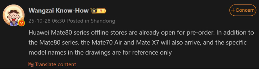 雖然華為尚未公佈 Mate 80 系列的正式發佈日期,但國內已掀起一波「預訂暗潮」。據微博爆料達人 @WangzaiKnowsEverything 透露,部分國內線下實體店已悄悄開放 HUAWEI Mate 80 系列預約登記,甚至連從未曝光的 Mate 70 Air 與 Mate X7 摺疊螢幕機型也出現在預訂名單中。