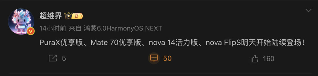 爆料人另文提到,在 Mate 70 優享版發佈後,陸續尚有 Pura X 優享版、nova 14 活力版跟 nova Flip S 細摺等多款新作推出。
