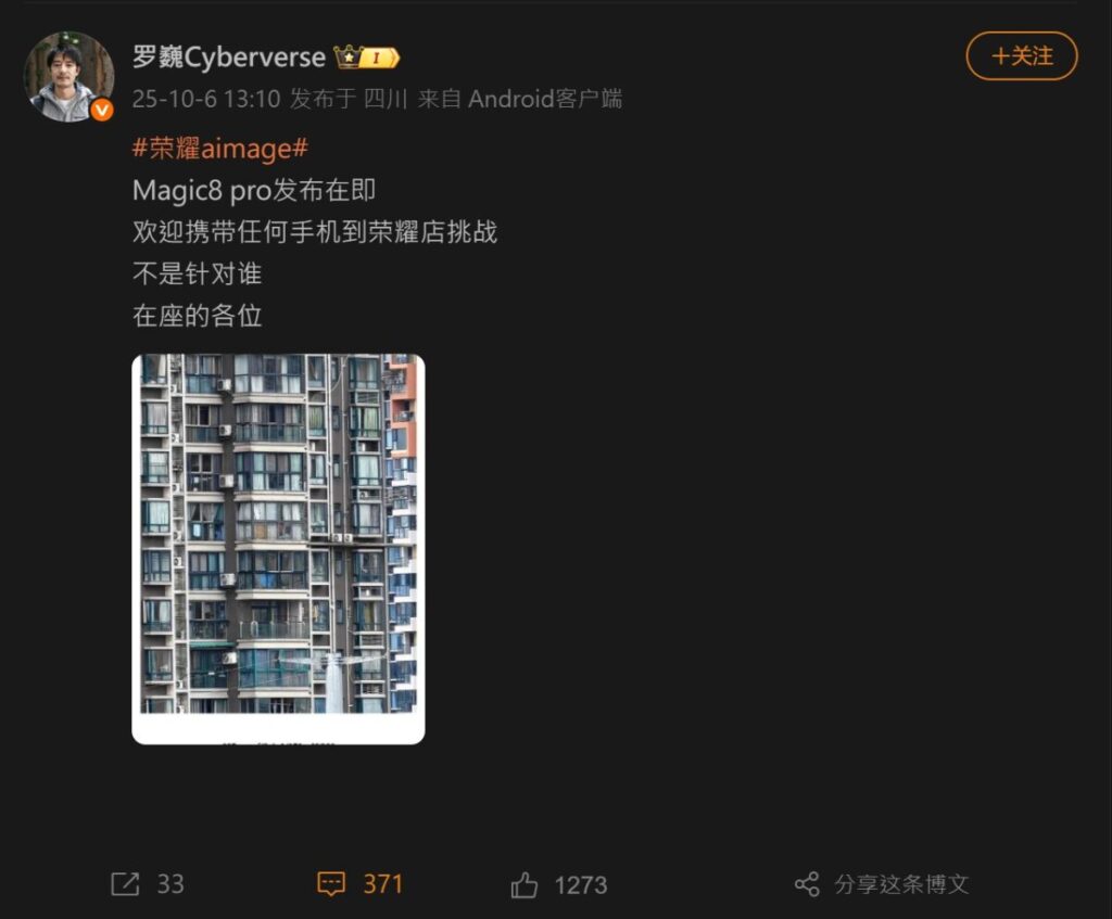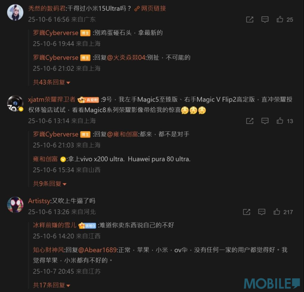 近日 HONOR 裝置部門的影像首席工程師羅巍在微博上發文,透露新一代旗艦 Magic 8 系列即將登場,並邀請消費者到門市「帶任何手機」與 Magic 8 或 Pro 版本進行實測比較。此舉引發網友熱烈討論,更有網友直接提問:「Magic 8 Pro 的相機能否打敗 Xiaomi 15 Ultra?」而羅巍的回應更是耐人尋味。