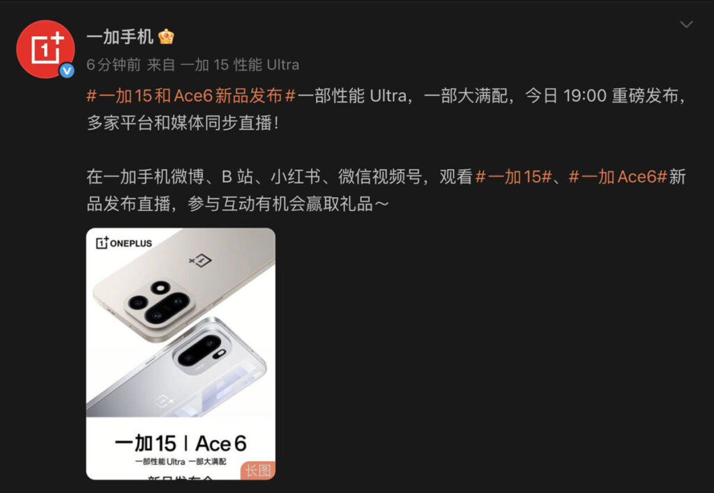 據「一加手機」官方微博公佈資訊,其將於香港時間今日(10 月 27 日)晚上 7 時舉行 OnePlus 15 跟 One Ace 6 的新品發佈會,同時宣佈產品價格詳情。