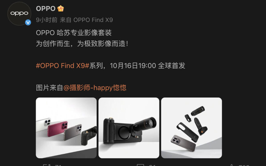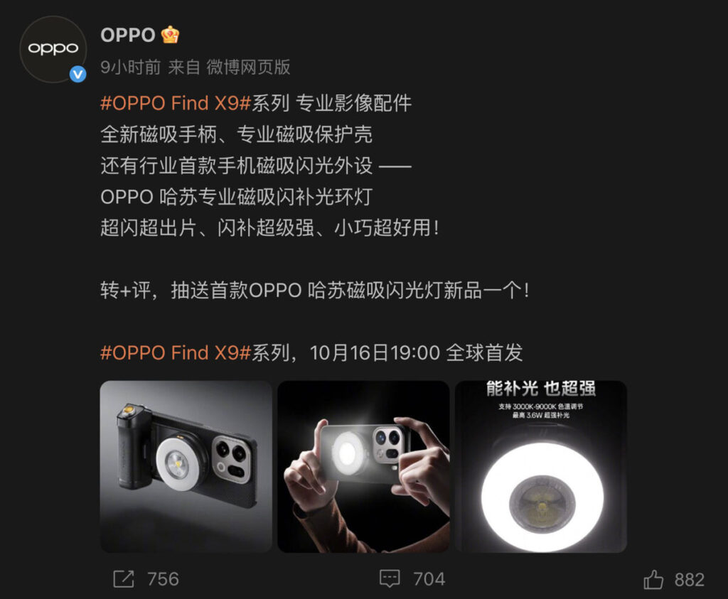 預計 10 月 16 日(週四)舉行新品發佈會的 OPPO 攝影旗艦 Find X9 系列,較早前除經官方渠道披露裝置外觀設計,同時亦展示了 Find X9 哈蘇專業影像套裝配件,讓手機秒變專業攝影工具。