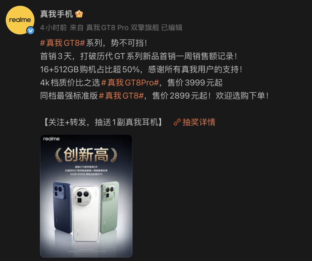 據 realme 在「真我手機」官方微博帳號公佈資訊,realme GT8 系列旗艦手機,首銷三天銷售額、已打破系列歷代產品首週銷量紀錄,成績表現理想。