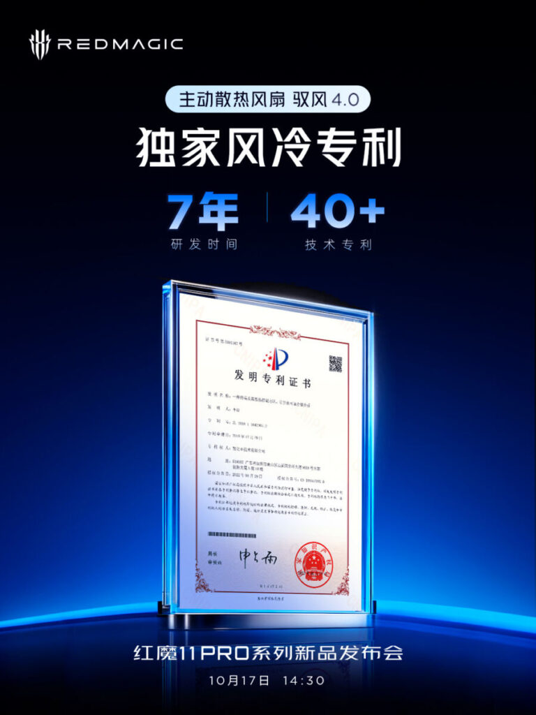 同時品牌又提到,這次紅魔 11 Pro 系列採用的「馭風 4.0」風扇,經 7 年研發且擁有超過 40 項技術專利,估計為強調與同類產品的技術領先表現。