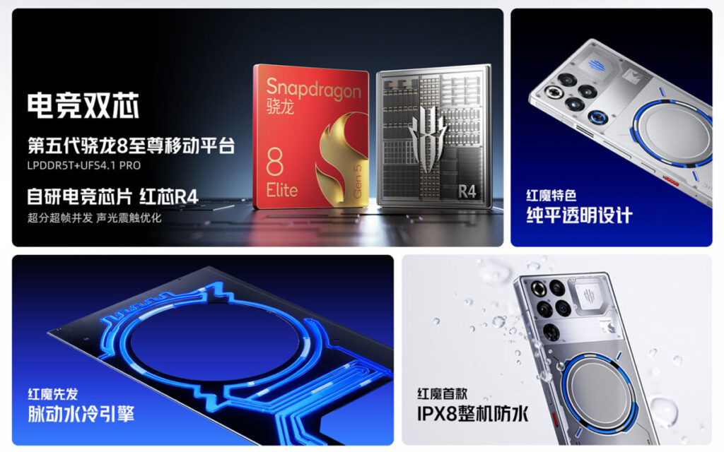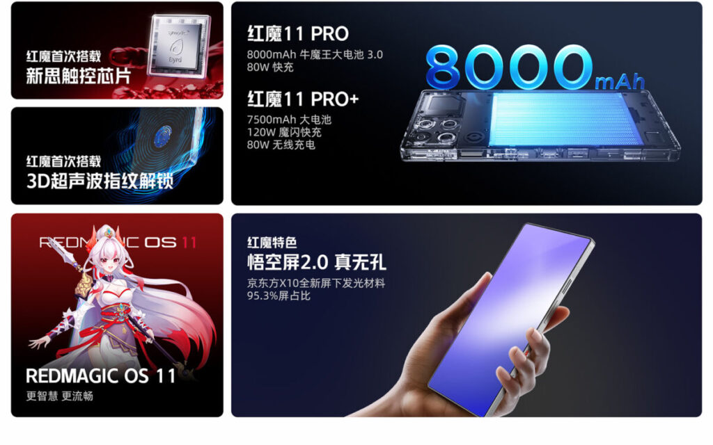 紅魔 11 Pro 系列採用 S8 Elite Gen 5 晶片,LPDDR5T RAM 配 UFS 4.1 Pro 儲存,跟自家紅芯 R4 晶片,真全屏換上 X10 面板並新增超聲波指紋辨識。