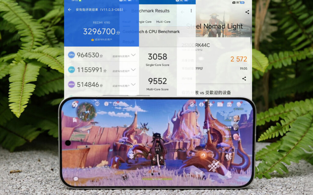 文中亦展示了 REDMI K90 效能測試表現,其在《Antutu》 測試達逾 329 萬分,《GeekBench 6》 3,058 / 9,552 而《3DMark》 光追表現亦同樣不錯。