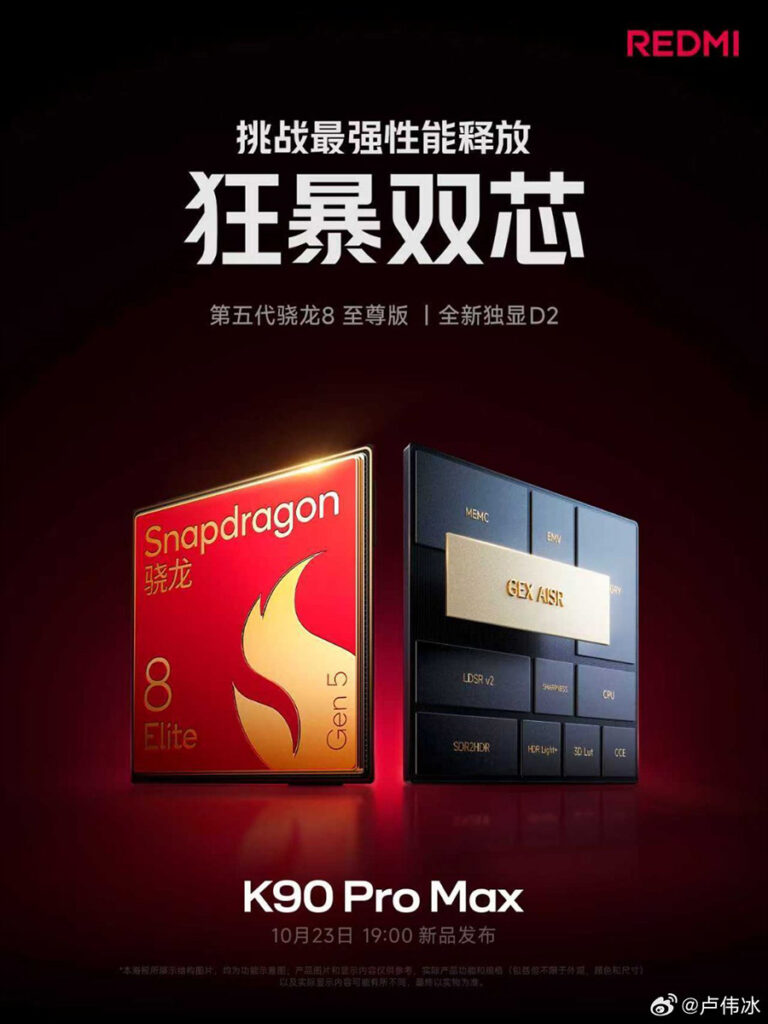 REDMI K90 Pro Max 確認採用 S8 Elite Gen 5 晶片、加配自家 AI 獨顯 D2 晶片,內置 7,560mAh 電池支援 100W 有線 / 50W 無線充電,更兼容 100W PPS 協議。
