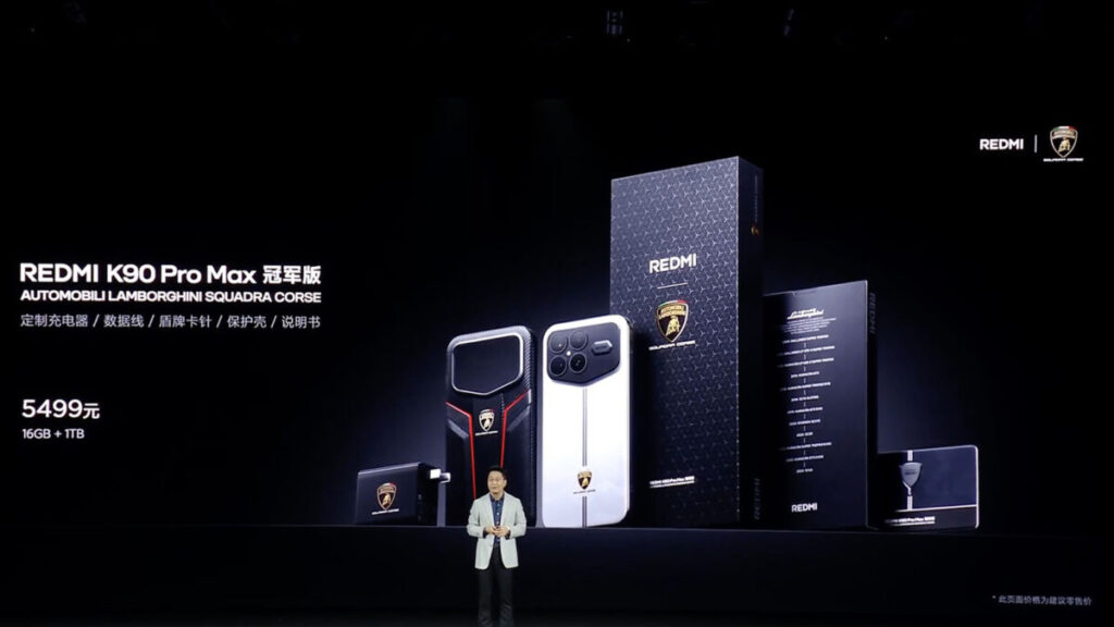 小米亦加推聯乘林寶堅尼的 REDMI K90 Pro Max 冠軍版,機身及隨機保護殼加入超跑風格並刻印品牌標誌,具 16+1TB 儲存售 3,999 人民幣(約港幣 $6,000)。