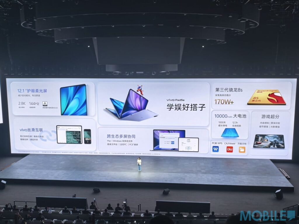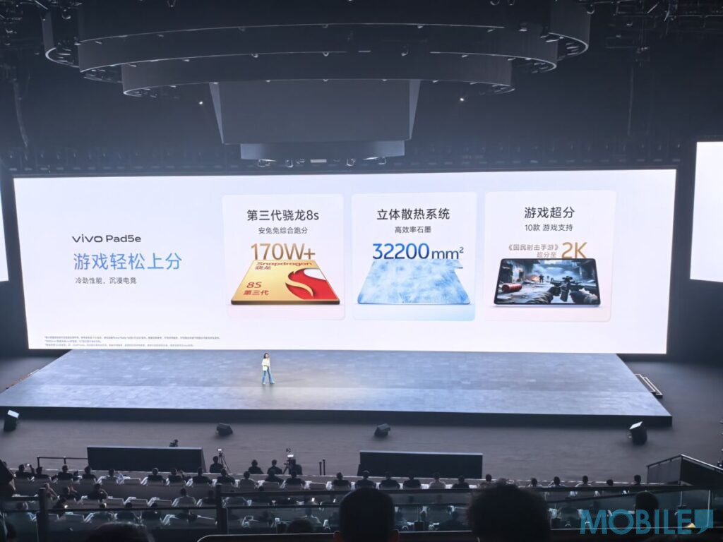核心效能方面,Pad 5e 採用 Snapdragon 8s Gen 3 處理器,提供 8GB / 12GB / 16GB 三種 RAM 與 128GB 至 512GB 的儲存空間選擇。內建 10,000mAh 大容量電池,支援 44W 有線快充。攝影鏡頭則配置 800 萬像素主鏡頭與 500 萬像素前置自拍鏡頭,系統則預載最新的 OriginOS 5。