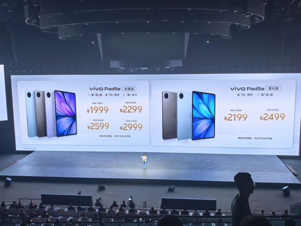 vivo Pad 5e 建議售價由人民幣 1,999 元(約港幣 $2,180)起,對應 8GB + 128GB 版本,頂配的 16GB + 512GB 型號則為人民幣 2,999 元(約港幣 $3,270),將於 10 月 17 日起在中國市場正式開售。