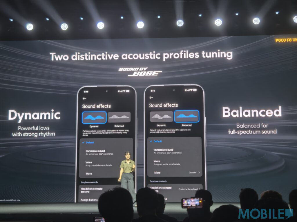 音效方面,POCO 與 BOSE 合作開發三揚聲器系統,機身背部配備超規格 2016 雙音圈揚聲器,透過增加音圈提升振膜面積,從而增強響度與聲壓,厚度減少 15%,響度提升 78%。低頻部分經過特別優化,補足 60 – 200Hz 頻段,使低音表現更加突出。實際試聽時,播放杜比全景聲影片可感受到強烈的聲音包圍感與方位感,低頻效果層次分明。