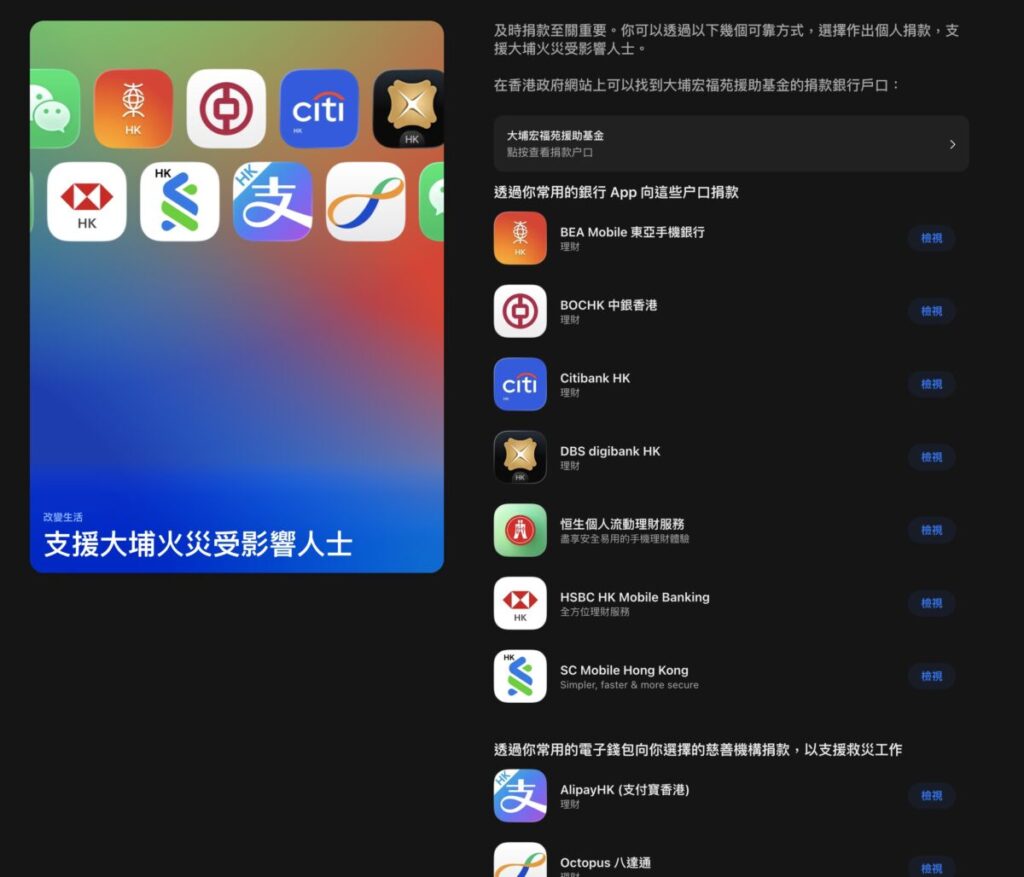 較早前 Apple 在 App Store 專欄架設了大埔宏福苑援助基金捐款頁面,專頁內附香港政府大埔宏福苑援助基金網站鏈結,及常用銀行 / 支付 App 快捷鍵,方便市民登入及捐款。
