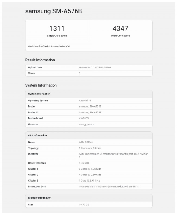 根據資料顯示,Galaxy A57 將搭載全新的 Exynos 1680 處理器,作為現行 A56 所用 Exynos 1580 的後繼型號。需要留意的是,目前晶片顯然仍處於測試階段,因此其跑分成績僅供參考。在 Geekbench 6.5 for Android 的測試中,該裝置取得了單核 1,311 分與多核 4,347 分的成績。