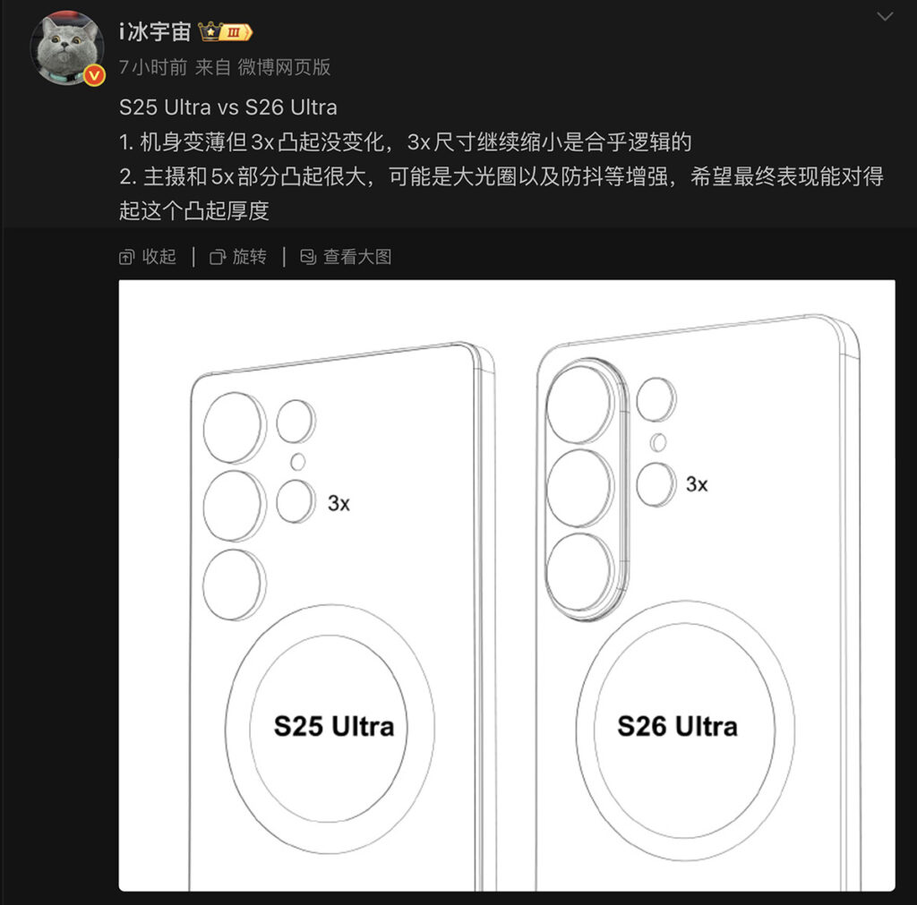 爆料達人「i 冰宇宙」較早前則在微博補充,指因為 S26 Ultra 厚度將比前代更薄,故攝像模組改用近似 Z Fold7 突出設計,除美術統一亦可能考慮佔位問題。