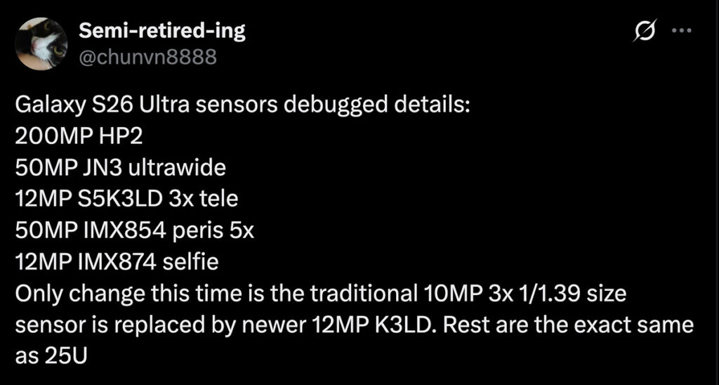 其中消息人 @chunvn8888 日前在 X 帳號,透露 S26 系列頂配機型 Galaxy S26 Ultra 的鏡頭配置,據悉其大致保持前代用料,僅更換了 3x 焦距鏡頭。
