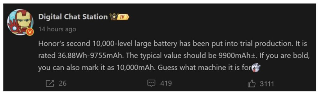 知名爆料達人 @DigitalChatStation 於微博透露,近期已確認兩款超大容量電池方案 9000mAh 與 10000mAh 均進入試產流程,即將裝配於新一代機型。雖然未明確指定型號,但根據過往爆料脈絡,這枚突破性的 10000mAh 電池極有可能專為 HONOR Power 2 量身打造。