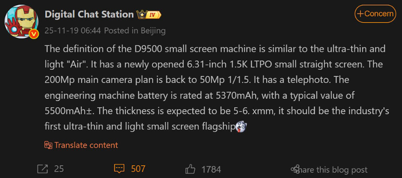 外觀設計方面,爆料者提到這款手機將採用極致輕薄的機身結構,並配備一塊 6.31 吋的 LTPO 小尺寸平面螢幕,解像度為 1.5K。據稱機身厚度僅為 5.6mm,定位介於 iPhone Air 與 Mate 70 Air 之間。