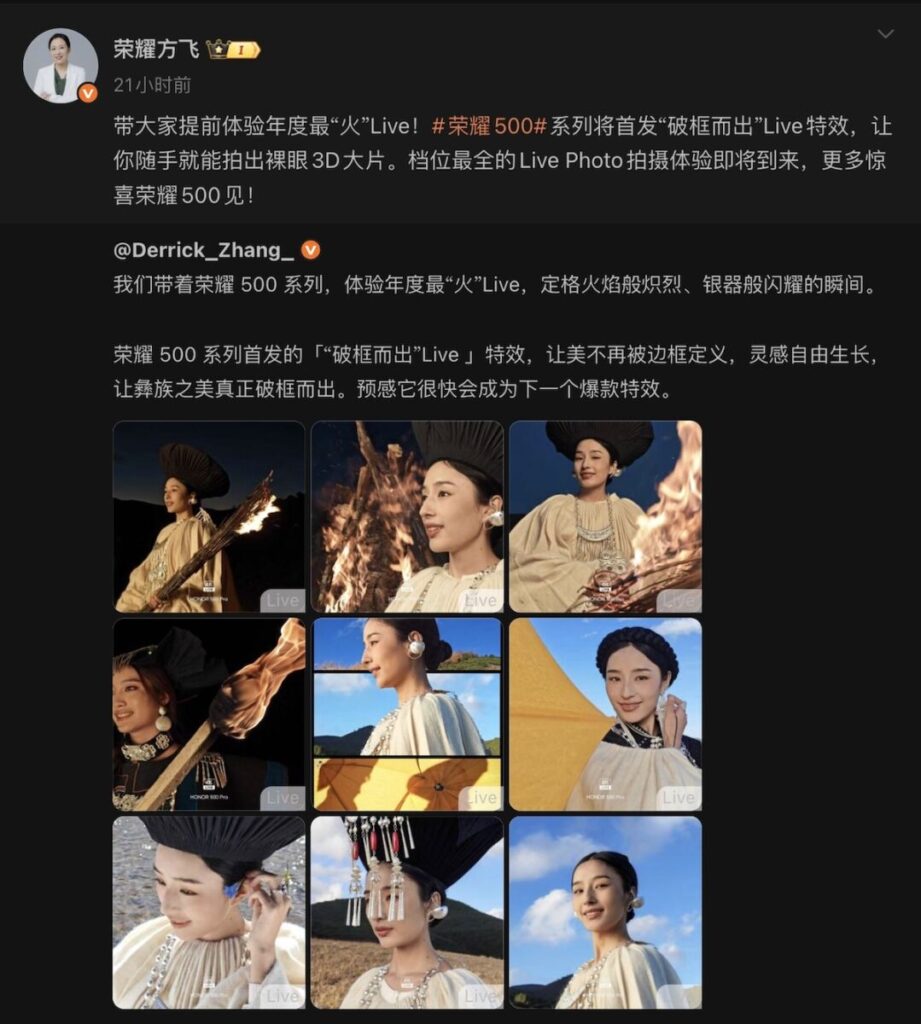 榮耀終端股份有限公司產品線總裁方飛,早前透過微博帳號率先披露 HONOR 500 系列「破框而出」Live 特效,稱其能輕鬆拍出裸眼 3D 效果影片。