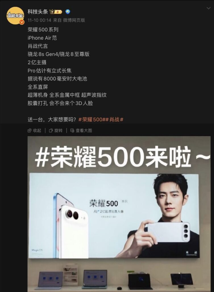 另外數碼博主「科技頭條」又上傳疑似於 HONOR 實體店拍攝照片,當中顯示 HONOR 500 系列宣傳照片,曝光標準版跟 HONOR 500 Pro 兩機外觀設計。
